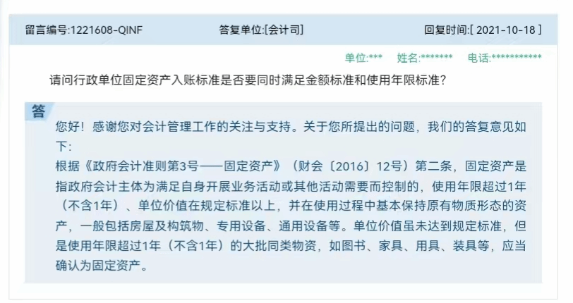 请问行政单位固定资产入账标准是否要同时满足金额标准和使用年限标准?