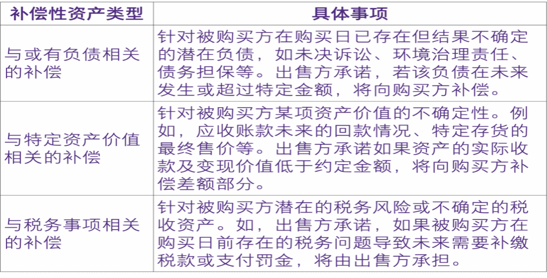 在非同一控制下企业合并中,出售方与购买方可能作出合同约定,针对被购买方某些或有事项,或者特定资产或负债的某些不确定性结果,出售方给予购买方补偿,购买方因此获得补偿性资产。例如,出售方针对被购买方某或有事项产生的负债或该负债超过约定金额而引致的损失,给予购买方补偿等。