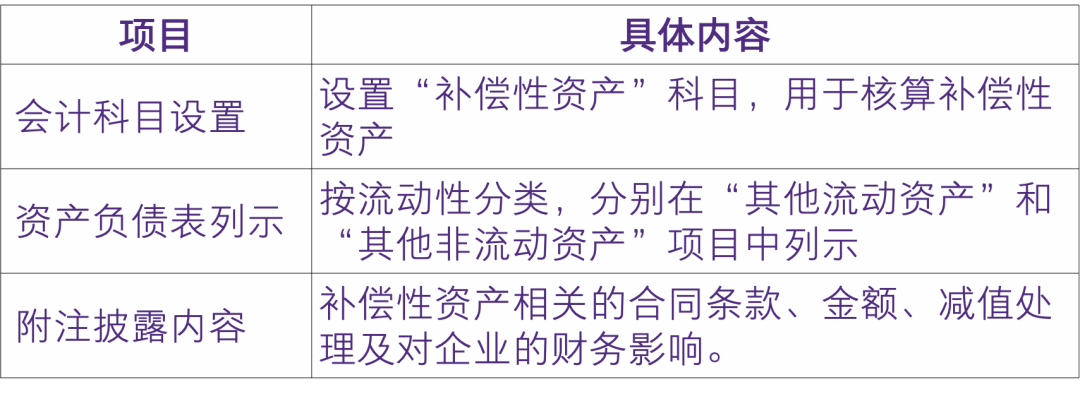 企业应当设置“补偿性资产”科目对补偿性资产进行会计核算,并按照《企业会计准则第30号——财务报表列报》规定,在资产负债表中对补偿性资产按照流动性分别在“其他流动资产”和“其他非流动资产”项目中列示。企业应当在财务报表附注中披露与补偿性资产相关的合同条款、金额、减值处理以及对企业的财务影响等信息。