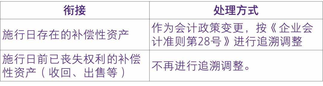 企业在首次执行本解释内容时,对于本解释施行日存在的补偿性资产,应当按照《企业会计准则第28号——会计政策、会计估计变更和差错更正》等有关规定作为会计政策变更进行追溯调整;对于本解释施行日前已经收回、出售或以其他方式丧失对补偿性资产权利的,不再进行追溯调整。